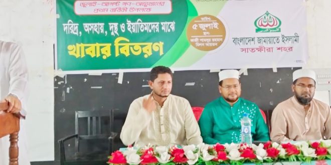 সাতক্ষীরা শহর জামায়াতের আমীর জাহিদুল ইসলামের সভাপতিত্বে অনুষ্ঠিত খাবার বিতরণ পূর্বক আলোচনা সভায় প্রধান অতিথি হিসেবে উপস্থিত ছিলেন বাংলাদেশ জামায়াতে ইসলামীর কেন্দ্রীয় সাংগঠনিক সেক্রেটারী, খলনা অঞ্চল পরিচালক, সাতক্ষীরা আসনে জামায়াত মনোনীত সংসদ সদস্য পদপ্রার্থী মুহাদ্দিস আব্দুল খালেক। এসময় জেলা জামায়াতের সহকারী সেক্রেটারী অধ্যাপক ওমর ফারুক, শহর জামায়াতের নায়েবে আমীর মাওলানা মুস্তাফিজুর রহমান, শহর সেক্রেটারী খোরশেদ আলমসহ অন্যান্য দায়িত্বশীল নেতৃবৃন্দ উপস্থিত ছিলেন।