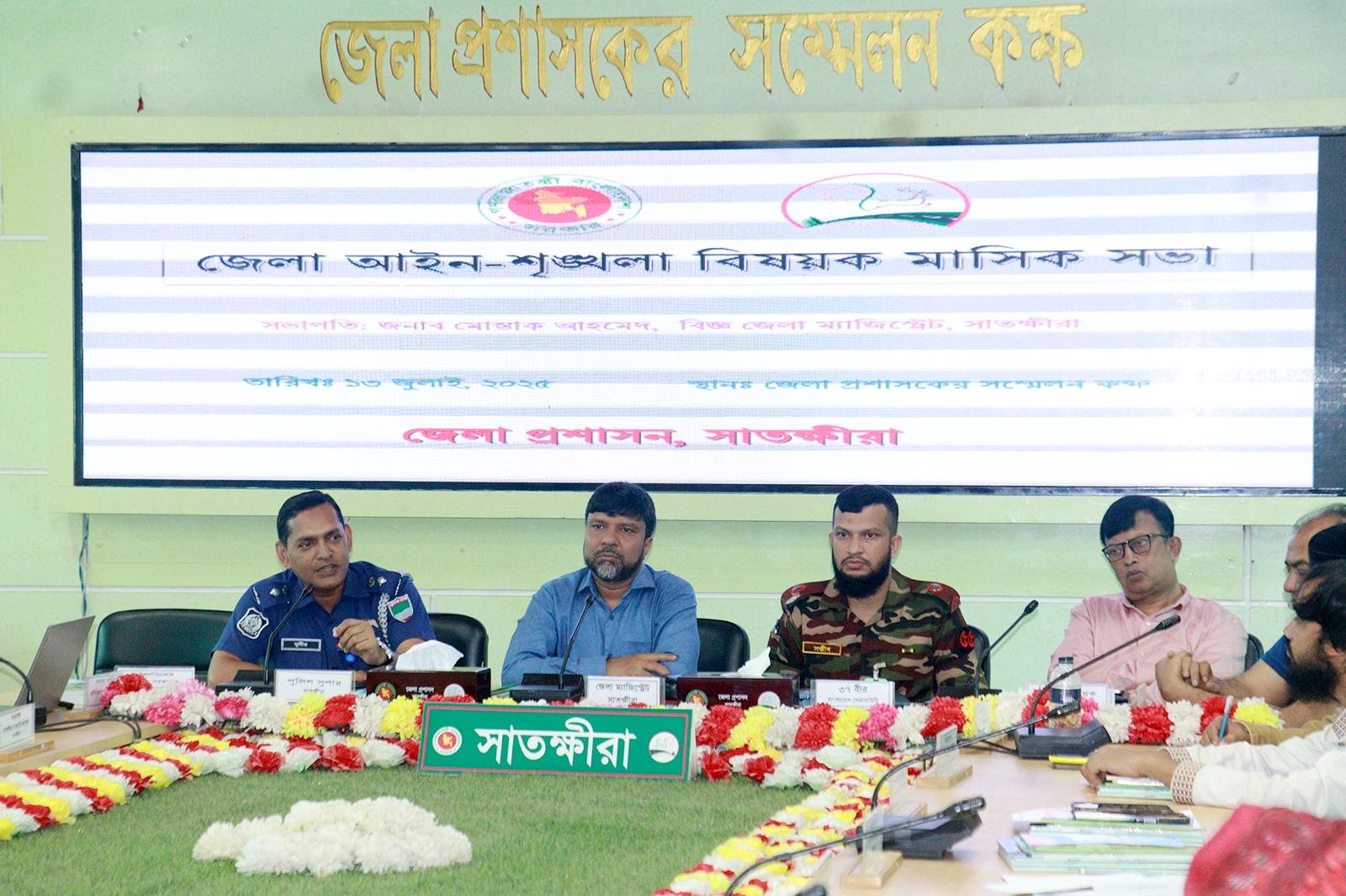 অদ্য ১৩ জুলাই ২০২৫ খ্রিঃ তারিখে জেলা প্রশাসকের কার্যালয়,সাতক্ষীরাতে জনাব মোস্তাক আহমেদ, জেলা প্রশাসক, সাতক্ষীরার সভাপতিত্বে জেলা আইন-শৃঙ্খলা বিষয়ক মাসিক সভা অনুষ্ঠিত হয়। উক্ত জেলা আইন-শৃঙ্খলা সভায় সম্মানিত সহ-সভাপতি হিসেবে উপস্থিত ছিলেন সাতক্ষীরা জেলা পুলিশের অভিভাবক সুযোগ্য পুলিশ সুপার জনাব মোহাম্মদ মনিরুল ইসলাম মহোদয়।
