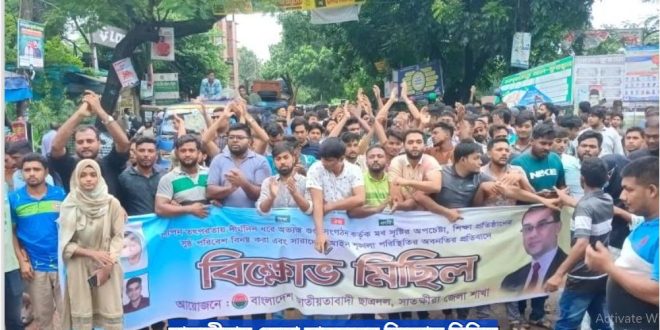 সোমবার (১৪ জুলাই) বিকেলে কেন্দ্রীয় কর্মসূচির অংশ হিসেবে বাংলাদেশ জাতীয়তাবাদী ছাত্রদল, সাতক্ষীরা জেলা শাখার উদ্যোগে শহরের নিউ মার্কেট এলাকা থেকে একটি বিক্ষোভ মিছিল বের হয়। মিছিলটি পাকাপুল মোড় হয়ে সদর থানা সড়ক প্রদক্ষিণ করে পি এন হাইস্কুলের সামনে গিয়ে শেষ হয়।