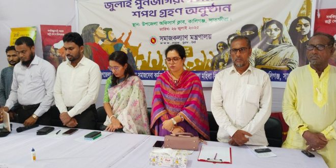 সাতক্ষীরার কালিগঞ্জে জুলাই পুনর্জাগরণে সমাজ গঠনে শপথ গ্রহণ শীর্ষক এক গুরুত্বপূর্ণ অনুষ্ঠান অনুষ্ঠিত হয়েছে। শনিবার (২৬ জুলাই ২০২৫) সকাল সাড়ে ১০টায় উপজেলা অফিসার্স ক্লাব মিলনায়তনে উপজেলা প্রশাসন, উপজেলা সমাজসেবা কার্যালয়, উপজেলা মহিলা বিষয়ক কর্মকর্তার কার্যালয় আয়োজনে এবং সমাজকল্যাণ মন্ত্রণালয় বাস্তবায়নে অনুষ্ঠানে সভাপতিত্ব করেন উপজেলা মহিলা বিষয়ক কর্মকর্তা অর্ণা চক্রবর্তী। প্রধান অতিথি হিসেবে উপস্থিত থেকে দিকনির্দেশনামূলক বক্তব্য রাখেন কালিগঞ্জ উপজেলা নির্বাহী অফিসার অনুজা মণ্ডল। বিশেষ অতিথি হিসেবে বক্তব্য রাখেন উপজেলা সহকারী কমিশনার (ভূমি) অমিত কুমার বিশ্বাস, উপজেলা সমাজসেবা কর্মকর্তা জিল্লুর রহমান, উপজেলা বিএনপির সাবেক সদস্য সচিব শেখ শফিকুল ইসলাম বাবু, উপজেলা বৈষম্য বিরোধী ছাত্র আন্দোলন কমিটির সদস্য সচিব মারুফ হাসান।