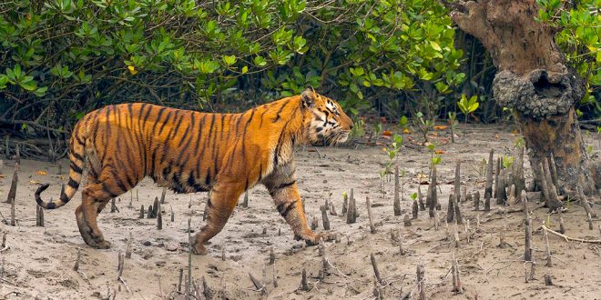 আবু সাইদ বিশ্বাস, সাতক্ষীরাঃ উদ্বেগজনক হারে কমছে বিশ্বের বৃহত্তম ম্যানগ্রোভ বন সুন্দরবনের বাঘ। জলবায়ু পরিবর্তনের প্রভাবে জোয়ারের সময় নদীর পানির উচ্চতা বাড়ছে। এতে বনভূমি ডুবে যাওয়ার পরিমাণ বাড়ায় কমে যাচ্ছে বাঘের বিচরণ ক্ষেত্র। পাশাপাশি লবণাক্ততা বাড়তে থাকায় প্রয়োজনীয় মিষ্টি পানি না পেয়ে লবণাক্ত পানি পান করে অসুস্থ হয়ে পড়ছে বাঘ। এ ছাড়া নির্বিচারে বন উজাড়, অপরিকল্পিত পর্যটন ও বনের মধ্য দিয়ে ভারী নৌযান চলাচলের কারণে বিরূপ প্রভাব পড়ছে বাঘের বংশবৃদ্ধির ওপর। বন বিভাগ ও স্থানীয় বিশেষজ্ঞরা সুন্দরবনে বাঘ কমে যাওয়ার প্রধান পাঁচটি কারণ চিহ্নিত করেছেন। এর মধ্যে রয়েছেথ চোরা শিকারিদের বাঘ শিকার, খাদ্য সংকটসহ বিভিন্ন প্রাকৃতিক কারণে লোকালয়ে চলে আসা বাঘ পিটিয়ে হত্যা, বার্ধক্য ও লবণাক্ত পানি পানে লিভার সিরোসিসে আক্রান্ত হওয়া এবং ঘূর্ণিঝড় ও জলোচ্ছ্বাসে বাঘের মৃত্যু।