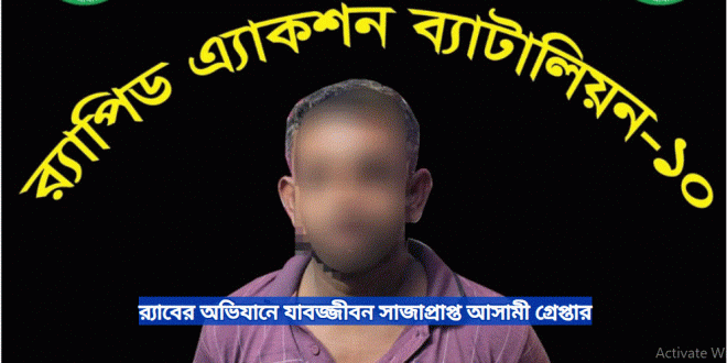 র্যাব এর আভিযানে যাবজ্জীবন সাজাপ্রাপ্ত পলাতক আসামিকে গ্রেপ্তার হয়েছে। ০১ আগষ্ট রাতে র্যাব-৬, সিপিসি-১, সাতক্ষীরা কোম্পানি এবং র্যাব-১০ এর যৌথ আভিযানে উক্ত আসামীকে গ্রেপ্তার করা হয়।