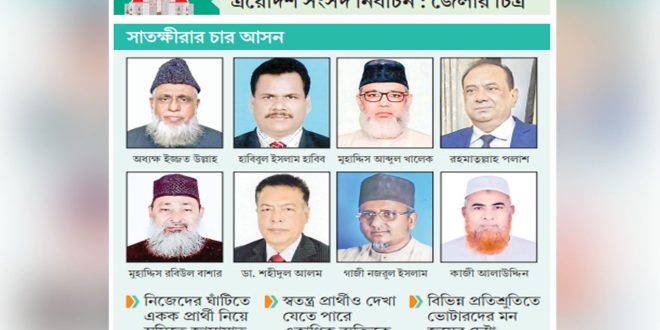 আগামী ফেব্রুয়ারিতে ত্রয়োদশ জাতীয় সংসদ নির্বাচনের ঘোষণায় সাতক্ষীরার সবকটি আসনে প্রার্থী ও মনোনয়নপ্রত্যাশীদের মধ্যে নির্বাচনি ব্যস্ততা বেড়েছে। বিভিন্ন প্রতিশ্রুতিতে ভোটারদের মন জয়ের চেষ্টা চালিয়ে যাচ্ছেন তারা। জেলার চারটি নির্বাচনি আসনে এবার তিন ডজনের বেশি প্রার্থী প্রতিদ্বন্দ্বিতা করতে পারেন বলে জানা গেছে। তবে যারাই প্রার্থী হন না কেন, এবার মূল প্রতিদ্বন্দ্বিতা বাংলাদেশ জাতীয়তাবাদী দল (বিএনপি) এবং বাংলাদেশ জামায়াতে ইসলামীর নেতাদের মধ্যেই হবে বলে মনে করছেন সংশ্লিষ্ট এলাকার ভোটার ও সচেতন মহল।