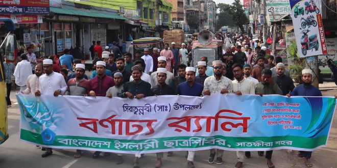 ছাত্র—জনতার জুলাই গণঅভ্যুত্থান পরবতীর্ রাষ্ট্র ব্যবস্থাকে রাসূল (সাঃ) এর আদর্শে উজ্জীবিত করে গড়ে তোলার লক্ষ্যে ছাত্রশিবির সাতক্ষীরা শহর শাখার উদ্যোগে একটি বর্ণাঢ্য র্যালি বের করে। র্যালিটি খুলনা রোড মোড় হয়ে নিউমার্কেটে পথসভার মাধ্যমে শেষ হয়।