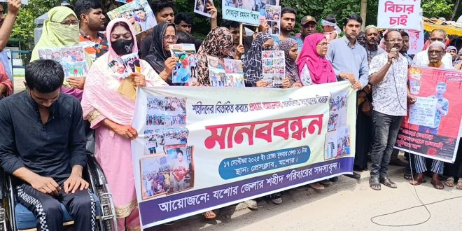 যশোরের জাবির হোটেল অগ্নিকাণ্ডে নিহত চতুর্থ শ্রেণির শিক্ষার্থী আবরার মাশরুন নীলসহ শহীদদের নিয়ে প্রথম আলোর প্রতিবেদনে ভুল ও বিভ্রান্তিকর তথ্য প্রকাশের অভিযোগ তুলেছেন নিহতদের স্বজনরা। এ নিয়ে বুধবার (১৭ সেপ্টেম্বর) যশোর প্রেসক্লাবের সামনে তারা বিক্ষোভ-মানববন্ধন করেন।