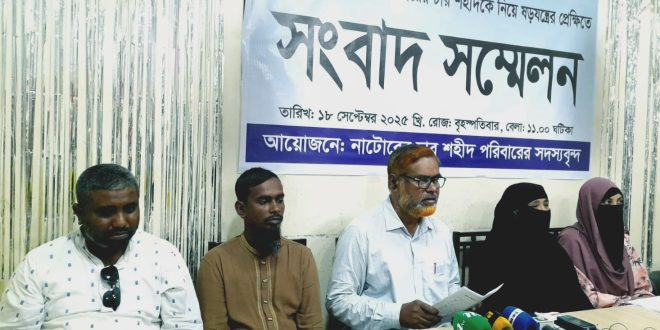 জুলাই গণঅভুত্থ্যানে নাটোরের চার শহীদকে নিয়ে প্রথম আলোর ষড়যন্ত্রের প্রেক্ষিতে সংবাদ সম্মেলন করেছনে শহীদ পরিবারের সদস্যরা। আজ সকাল ১১টার দিকে নাটোর শহরের একটি রেস্টুরেন্টে সংবাদ সম্মেলনে শহীদ মিকদাদ হোসেন খান আকীবের পিতা নাটোর জেলা জামায়াতের নায়েবে আমীর নাটোর সিটি কলেজের অধ্যক্ষ দেলোয়ার হোসাইন খান লিখিত বক্তব্য বলেন, জুলাই গণঅভুত্থ্যানে নিহত নাটোরের চার শহীদ পরিবারের পক্ষ থেকে অত্যন্ত বেদনার সাথে আপনাদের জানাচ্ছি যে, জুলাই গণঅভূত্থ্যান বিরোধী একটি জাতীয় দৈনিক পত্রিকা আমাদের পরিবারের শহীদদের নিয়ে ষড়যন্ত্র শুরু করেছে। আপনারা হয়ত দেখেছেন গত ১৫ সেপ্টেম্বর, ২০২৫খ্রিঃ সোমবার পত্রিকাটি তাদের প্রথম পৃষ্ঠায় সারাদেশের জুলাই গণঅভূখ্যানে নিহতদের নিয়ে একটি সংবাদ প্রকাশ করেছে। সেখানে বলা হয়েছে, নাটোরের তৎকালীন এমপি শফিকুল ইসলাম শিমুলের বাড়িতে আগুনে পুড়ে যে ৫জন শহীদ হয়েছেন তার মধ্যে শাওন খান সিয়াম একজন শহীদ হলেও বাকী চারজন শহীদ নয়। পত্রিকাটি আরো বলার চেষ্টা করেছে যে, পুলিশ বা আওয়ামী লীগের নেতাকর্মীদের মারপিট ও গুলিতে নিহত না হলে শহীদ হিসেবে গণ্য করা হবে না। তিনি আরো বলেন, আপনারা সকলেই জানেন, ২০২৪ এর জুলাই গণঅভুত্থ্যানের সময় শহীদ মিকদাদ হোসেন খান আকিবের পিতা অধ্যক্ষ দেলোয়ার হোসেন খান এই আন্দোলনে সহযোগীতার অভিযোগে আটক হয়ে নাটোর জেলা কারাগারে বন্দি ছিলেন। অপরদিকে শহীদ শরিফুল ইসলাম মোহনের ছেলে কলেজ ছাত্র ফারহান ফুয়াদ ৪ আগষ্ট নাটোর শহরে আন্দোলনের পক্ষে মিছিল সমাবেশ করার সময় নাটোরের তৎকালীন এমপি শফিকুল ইসলাম শিমুলের লোকজন ধরে নিয়ে নির্যাতন করেছিল। শহীদ মেহেদী হাসান রবিন ও একাদশ শ্রেণীর ছাত্র মিকদাদ হোসেন খান আকিবও সেদিন মিছিলে অংশ নিয়েছিল। পরের দিন ৫ তারিখ দুপুরে নাটোরে বিক্ষোভ মিছিল সমাবেশ হয়েছে। সেখানেও নিহতরা যোগদান করেছিল। পরবর্তীতে নাটোরের তৎকালীন এমপি শফিকুল ইসলাম শিমুলের আলোচিত বাড়ি জান্নাতী প্যালেস থেকে ৬আগষ্ট ভোরে কলেজ ছাত্র মিকদাদ হোসেন খান আকিব ও শাওন খান সিয়াম, স্কুল ছাত্র ইয়াসিন আলী ছাড়াও শরিফুল ইসলাম মোহনের মরদেহ উদ্ধার করা হয়। এর আগে অগ্নিকান্ডের সময় মেহেদী হাসান রবিনকে উদ্ধার করে হাসপাতালে পাঠালে চিকিৎসাধীন অবস্থায় তারও মৃত্যু হয়। সকলের মৃত্যুর ঘটনায় নাটোর থানা ও আদালতে সুনিদিষ্ট ভাবে তৎকালীন ফ্যাসিবাদী সরকারের প্রধান শেখ হাসিনা ও নাটোরের তৎকালীন এমপি জেলা আওয়ামী লীগ নেতা শফিকুল ইসলাম শিমুলসহ সন্দেহভাজনদের বিরুদ্ধে হত্যা মামলা দায়ের করা হয়েছে। আরো পরে বর্তমান সরকার এবং জুলাই স্মৃতি ফাউন্ডেশন নিহতদের যাবতীয় তথ্য চেয়ে পাঠায়। আমরা সকলে জেলা ও উপজেলা প্রশাসনের মাধ্যম