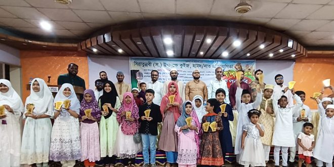 ডিসেন্ট একাডেমীর আয়োজনে সাতক্ষীরায় সিরাতুন্নবী (সা.) উপলক্ষে কুইজ, হামদ- নাত প্রতিযোগিতা ও পুরস্কার বিতরণী অনুষ্ঠিত হয়েছে। শনিবার বিকালে লেকভিউ হল রুমে ডিসেন্ট একাডেমীর পরিচালক আবুল কাশেম এর সভাপতিত্বে সুস্থ সংস্কৃতির বিকাশের জন্য হামদ-নাত প্রতিযোগিতা অনুষ্ঠিত হয়। এর আগে স্মার্ট মেডিকেল সাতক্ষীরার সৌজন্যে সাতক্ষীরার বিভিন্ন শিক্ষা প্রতিষ্ঠানের শিশু শিক্ষার্থীদের মাঝে মহানবী (সা.) সিরাতের উপর কুইজ প্রতিযোগিতা অনুষ্ঠিত হয়। প্রতিযোগিতা শেষে বিজয়ীদের মাঝে পুরস্কার বিতরণ করা হয়। প্রধান অতিথি হিসেবে উপস্থিত ছিলেন ডিসেন্ট একাডেমীর প্রধান উপদেষ্টা ও বাংলাদেশ জামায়াতে ইসলামী সাতক্ষীরার শহর আমির জাহিদুর রহমান। বিশেষ অতিথি ছিলেন ডিসেন্ট একাডেমীর উপদেষ্টা খোরশেদ আলম, আবু হাসান, আব্দুল ওয়াহাব আজাদ, মনিরুজ্জামান মনির, স্মার্ট মেডিকেল সেন্টার সাতক্ষীরার প্রশাসনিক কর্মকর্তা প্রাভাষক আব্দুল্লাহ আল মামুন। এ সময় ডিসেন্ট একাডেমীর বিভিন্ন পর্যায়ের শিল্পী, প্রতিযোগী এবং অভিভাবকবৃন্দ উপস্থিত ছিলেন। অনুষ্ঠানে বক্তারা সুস্থ সংস্কৃতির বিকাশে এ ধরনের কর্মকাণ্ডকে সাধুবাদ জানান এবং শিশুদের মানসিক বিকাশে ডিসেন্ট একাডেমীর কার্যক্রম অব্যাহত রাখার জন্য আহ্বান জানান।