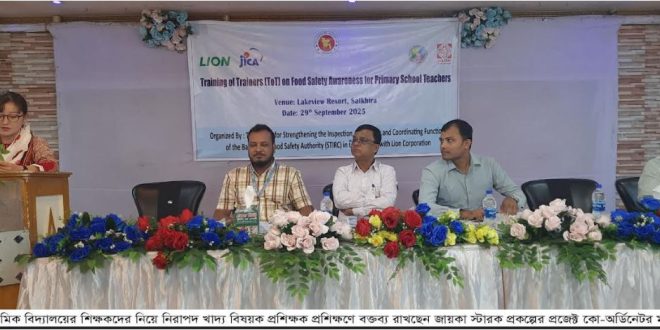 নিজস্ব প্রতিনিধি : সাতক্ষীরায় প্রাথমিক বিদ্যালয়ের শিক্ষকদের নিয়ে নিরাপদ খাদ্য বিষয়ক প্রশিক্ষক প্রশিক্ষণ প্রদান করা হয়েছে। সোমবার (২৯ সেপ্টেম্বর) জাপান ইন্টারন্যাশনাল কোঅপারেশন এজেন্সি (জায়কা) এবং বাংলাদেশ নিরাপদ খাদ্য কর্তৃপক্ষের স্টে্রনথেনিং দ্য ইনসপেকশন, রেগুলেটরি এন্ড কোঅরডিনেটিং (স্টারক) প্রকল্প, প্রাথমিক শিক্ষা অধিদপ্তর এর সার্বিক সহযোগিতায় এবং হাইজিন ও হেলথ প্রোডাক্টের জাপানি শীর্ষ স্থানীয় কোম্পানি লায়ন কর্পোরেশনের আর্থিক অনুদানে বাংলাদেশ নিরাপদ খাদ্য কর্তৃপক্ষ, জেলা কার্যালয়—সাতক্ষীরা কর্তৃক প্রাথমিক বিদ্যালয়ের শিক্ষকদের জন্য নিরাপদ খাদ্য বিষয়ে সচেতনতামূলক (ঃড়ঃ) প্রশিক্ষণের আয়োজন করা হয়। শহরের লেকভিউ রিসোর্টে দিনব্যাপী এ প্রশিক্ষণে সাতক্ষীরা জেলার মোট ৪০ জন সরকারি প্রাথমিক বিদ্যালয়ের শিক্ষক অংশগ্রহণ করেন।