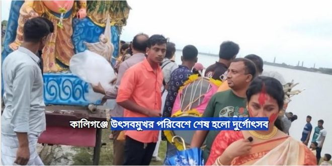 বিজয়া দশমীতে প্রতিমা বিসর্জনের মধ্য দিয়ে শেষ হলো সনাতন ধর্মাবলম্বীদের সর্ববৃহৎ ধর্মীয় উৎসব শারদীয় দুর্গাপূজা। জানা গেছে, এবছর সাতক্ষীরার কালিগঞ্জে ৫০পূজাম-পে ধর্মীয় ভক্তি ও উৎসবমুখর পরিবেশে শারদীয় দুর্গোৎসব অনুষ্ঠিত হয়। বৃহস্পতিবার (২ অক্টোবর) প্রতিমা বিসর্জনের মধ্য দিয়ে এ উৎসবের পরিসমাপ্তি ঘটে।