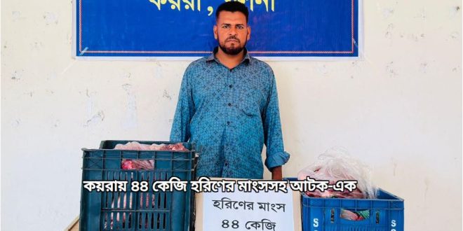 কয়রা (খুলনা) প্রতিনিধি: খুলনার কয়রা থানা পুলিশ ও নৌবাহিনীর যৌথ অভিযানে ৪৪ কেজি হরিণের মাংসসহ সেলিম হাওলাদার নামের এক ব্যক্তিকে আটক করা হয়েছে। তিনি ৬নং কয়রা এলাকার মৃত এইচ,এম শওকত হোসেনের ছেলে।