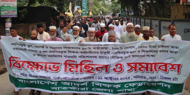 শিক্ষক—কর্মচারীদের ৫০ শতাংশ বাড়ি ভাড়া, ১০০ শতাংশ উৎসব ভাতার দাবিতে সাতক্ষীরায় আদর্শ শিক্ষক ফেডারেশনের বিক্ষোভ সমাবেশ
