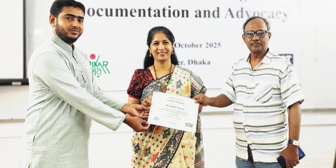 সাতক্ষীরা প্রতিনিধি: আন্তর্জাতিক মানবাধিকার ফেডারেশন (FIDH)-এর সদস্য বাংলাদেশের মানবাধিকার সংস্থা (অধিকারের) উদ্যোগে ১৯ অক্টোবর (রবিবার) ঢাকায় ৩ দিনব্যাপী মানবাধিকার বিষয়ক প্রশিক্ষণ কর্মশালা শেষে সাংবাদিক মুজাহিদুল ইসলামকে মানবাধিকারের সনদ প্রদান করা হয়। এ সময় সনদ প্রদান করেন (অধিকার) মানবাধিকার সংস্থার পরিচালক তাসকিন ফাহমিনা, পরিচালক এ এস এম নাসির উদ্দিন এলান। আরো উপস্থিত ছিলেন (অধিকার) মানবাধিকার সংস্থার সাধারণ সম্পাদক ডা. সাইরা রহমান খান । এ সময় সাংবাদিক মুজাহিদুল ইসলামকে (অধিকার) মানবাধিকার সংস্থার সাতক্ষীরা জেলার কো-অর্ডিনেটরের দায়িত্ব দেওয়া হয়।