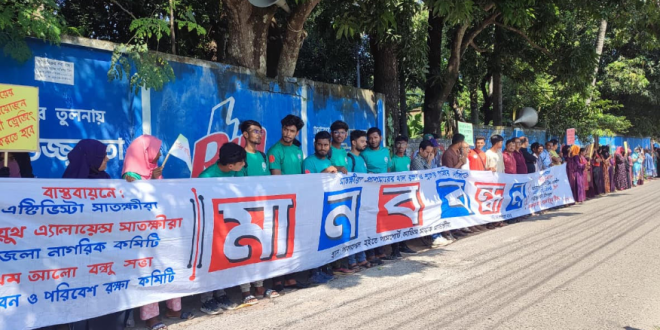 শাহ জাহান আলী মিটন, সাতক্ষীরা প্রতিনিধি:সাতক্ষীরার প্রাণসায়ের খাল রক্ষা, জলাবদ্ধতা দূরীকরণ ও সুপেয় পানির বিষয়ে মানববন্ধন অনুষ্ঠিত হয়েছে।