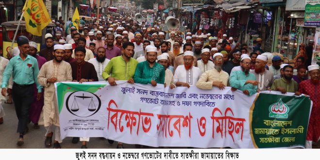 জুলাই জাতীয় সনদ বাস্তবায়নের লক্ষ্যে প্রয়োজনীয় সাংবিধানিক আদেশ জারি ও নভেম্বরের মধ্যেই গণভোট আয়োজনসহ পাঁচ দফা দাবিতে বিক্ষোভ মিছিল ও সমাবেশ করেছে সাতক্ষীরা জামায়াত।