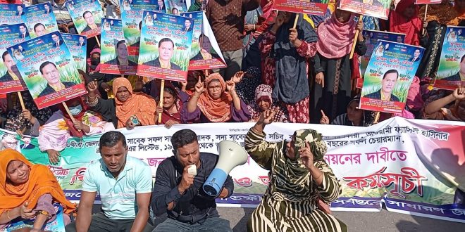 শাহ জাহান আলী মিটন, সাতক্ষীরা :সাতক্ষীরা-১ (সদর-দেবহাটা) আসনে সাতক্ষীরা জেলা বিএনপির সাবেক সদস্য সচিব ও বর্তমান আহবায়ক কমিটির সদস্য চেয়ারম্যান আব্দুল আলিমকে ধানের শীষে মনোনয়নের দাবীতে সাতক্ষীরায় সড়ক অবরোধ করে বিক্ষোভ মিছিল করে আলিম চেয়ারম্যানের সমর্থকরা। মঙ্গলবার বেলা ১১ টা থেকে ১ পর্যন্ত টানা ২ ঘন্টা সাতক্ষীরা – খুলনা মহা সড়কের মিলবজার এলাকায় সড়ক অবরোধ করে এ বিক্ষোভ মিছিল ও সমাবেশ করে বিএনপির নেতাকর্মীরা। এসময় বক্তব্য রাখেন, – লাবসা ইউনিয়ন বিএনপির সভাপতি শফিকুল ইসলাম, সদর উপজেলা বিএনপির নেতা আতিয়ার রহমান, জেলা স্বেচ্ছাসেবক দলের যুগ্ন আহ্বায়ক আনারুল ইসলাম, ইউপি সদস্য বিএনপিনেতা তাজমিনুর রহমান টুটুল, ইসমাইল হোসেন নিরবসহ বিএনপির অঙ্গ ও সহযোগী সংগঠনের নেতাকর্মী ও আলিম চেয়ারম্যানের সমর্থকগন। চেয়ারম্যান আব্দুল আলিম চেয়ারম্যান আব্দুল আলিমের সমর্থনে নারী পুরুষরা সড়কে শুয়ে পড়ে বিক্ষোভ করে।