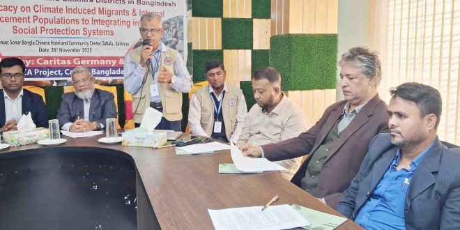 সাতক্ষীরা সংবাদদাতা: সাতক্ষীরায় জলবায়ু পরিবর্তনের প্রভাবে অভ্যন্তরীণ অভিবাসন,স্থানচ্যুতি জনগোষ্ঠীকে সামাজিক সুরক্ষায় অন্তভুক্তি করার উপর মিডিয়া এ্যাডভোকেসি সভা অনুষ্ঠিত হয়েছে। বুধবার (২৬ নভেম্বর) সকাল সাড়ে ১০ টায় সোনার বাংলা চাইনিজ হোটেল এন্ড কমিউনিটি সেন্টারের সম্মেলন কক্ষে কারিতাসের বিএমজেড- ডিআরআর – সিসিএ প্রকল্পের সহযোগিতায় এই এ্যাডভোকেসি সভা অনুষ্ঠিত হয়। অনুষ্ঠানে মুল বিষয়ের উপর প্রবন্ধ উপস্থাপন করেন খুলনা প্রকৌশল ও প্রযুক্তি বিশ্ববিদ্যালয়ের দুর্যোগ ব্যবস্থাপনা ইন্সটিটিউটের সহকারি অধ্যাপক ড. মোঃ ইসমাইল হোসেন। সাতক্ষীরা প্রেসক্লাবের সভাপতি মনিরুল ইসলাম মিনির সভাপতিত্বে ও প্রকল্পের ফিল্ড কো-অর্ডিনেটর মোঃ ইব্রাহিম হোসেনের পরিচালনায় এ উপলক্ষে আলোচনা সভায় বক্তব্য রাখেন