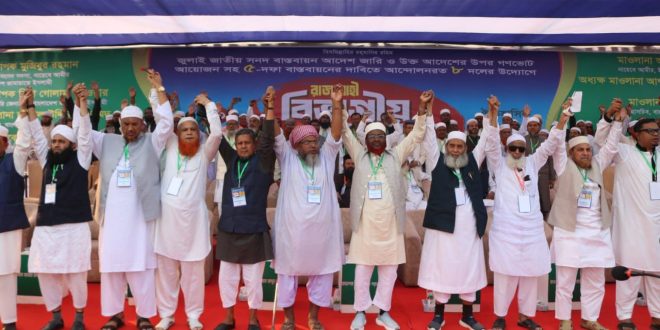 জুলাই জাতীয় সনদ বাস্তবায়ন আদেশ জারি ও আদেশের ওপর গণভোট আয়োজনসহ পাঁচ দফা দাবিতে রোববার (৩০ নভেম্বর) বিকেলে আট দলীয় জোটের উদ্যোগে রাজশাহীর ঐতিহাসিক মাদরাসা মাঠে আয়োজিত বিশাল বিভাগীয় সমাবেশে তারা এসব কথা বলেন।