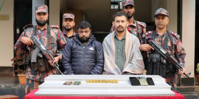 যশোরে বর্ডার গার্ড বাংলাদেশ বিজিবি’র অভিযানে প্রায় দুই কোটি টাকার স্বর্ণসহ দুই পাচারকারী আটক হয়েছে। বৃহস্পতিবার (৪ ডিসেম্বর) ভোরে সদর উপজেলার মুরাদগড় বাসস্ট্যান্ড এলাকায় এ অভিযান চালানো হয়।