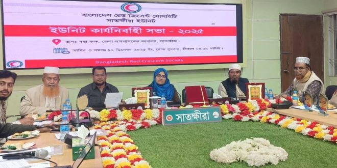 সাতক্ষীরা সংবাদদাতাঃ বাংলাদেশ রেড ক্রিসেন্ট সোসাইটি সাতক্ষীরা ইউনিট’র কার্যনির্বাহী কমিটির সভা ও নবনির্বাচিত এবং মনোনীত নেতৃবৃন্দের অভিষেক অনুষ্ঠান অনুষ্ঠিত হয়েছে। বুধবার (১০ ডিসেম্বর) সন্ধ্যায় সাতক্ষীরা জেলা প্রশাসকের সম্মেলন কক্ষে এ কার্যনির্বাহী কমিটির সভা ও অভিষেক অনুষ্ঠিত হয়। সভায় বাংলাদেশ রেড ক্রিসেন্ট সোসাইটি সাতক্ষীরা ইউনিট’র চেয়ারম্যান (পদাধিকারবলে) জেলা প্রশাসক মিজ আফরোজা আখতার এর সভাপতিত্বে বক্তব্য রাখেন রেড ক্রিসেন্ট সোসাইটি সাতক্ষীরা ইউনিট’র কার্যনির্বাহী কমিটির নবনির্বাচিত ভাইস চেয়ারম্যান মাওলানা মো: আজিজুর রহমান, সেক্রেটারি অধ্যাপক মুহাঃ ওমর ফারুক, কার্যনির্বাহী কমিটির নবনির্বাচিত সদস্য মো: জাহিদুল ইসলাম, মো: হাবিবুর রহমান, মো: শফিকুল ইসলাম, মনোনীত সদস্য আবুল কালাম বাবলা, ফরিদা আক্তার বিউটি, মোঃ মনিরুজ্জামান। এসময় রেড ক্রিসেন্ট সোসাইটি সাতক্ষীরা ইউনিট’র ইউনিট লেভেল অফিসার মো. হাসিবুল ইসলাম সোহান, যুব প্রধান ইকবাল কাদির উপস্থিত ছিলেন।