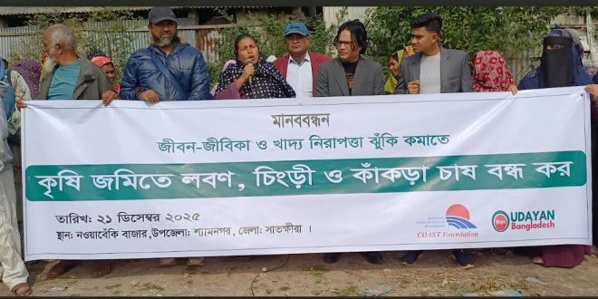 মানববন্ধনে বক্তারা বলেন, কৃষি জমিতে লবণাক্ত পানি প্রবেশ করিয়ে চিংড়ি ও কাঁকড়া চাষের ফলে ফসলি জমি নষ্ট হচ্ছে এবং মাটির উর্বরতা হারিয়ে যাচ্ছে। এতে খাদ্য উৎপাদন কমে যাচ্ছে এবং কৃষিনির্ভর মানুষের জীবন-জীবিকা মারাত্মকভাবে ক্ষতিগ্রস্ত হচ্ছে। দীর্ঘমেয়াদে এ পরিস্থিতি স্থানীয় জনগোষ্ঠীকে চরম ঝুঁকির মুখে ফেলছে বলে তারা মন্তব্য করেন।