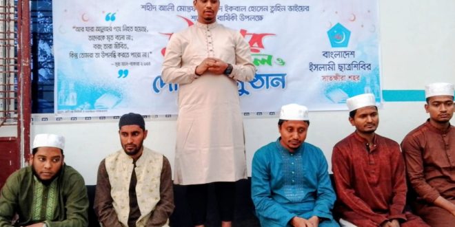 স্টাফ রিপোটার:বাংলাদেশ ইসলামী ছাত্রশিবির–এর উদ্যোগে শহীদ আলী মোস্তফা ও শহীদ ইকবাল হোসেন তুহিনের স্মরণে এক ইফতার মাহফিল ও দোয়া অনুষ্ঠান অনুষ্ঠিত হয়েছে। ২৮ ফেব্রুয়ারি (শনিবার) বিকাল ৫টায় শহীদ ইকবাল হোসেন তুহিনের বাসভবনে এ অনুষ্ঠান আয়োজন করা হয়। শহর অফিস সম্পাদক আরিফ বিল্লাহ–এর সঞ্চালনায় অনুষ্ঠানে প্রধান অতিথি হিসেবে বক্তব্য রাখেন শহর ছাত্রশিবিরের সভাপতি মেহেদী হাসান। প্রধান অতিথির বক্তব্যে তিনি বলেন, ইসলামী আন্দোলনের জন্য প্রয়োজনে জীবন দেওয়ার মানসিকতা সংগঠনের কর্মীদের মধ্যে রয়েছে। তিনি শহীদ আলী মোস্তফা ও শহীদ ইকবাল হোসেন তুহিনের আত্মত্যাগের কথা স্মরণ করে বলেন, তাঁদের রক্ত বৃথা যেতে দেওয়া হবে না। অনুষ্ঠানে আরও বক্তব্য রাখেন জেলা জামায়াতের অফিস সেক্রেটারি রুহুল আমিন, সাবেক শহর সভাপতি আল মামুন, অ্যাডভোকেট আবু তালেব, সাবেক জেলা সভাপতি আব্দুল গফুর এবং শহীদ ইকবাল হোসেন তুহিনের পিতা আব্দুল বারী। শেষে শহীদদের রূহের মাগফিরাত এবং দেশ ও জাতির কল্যাণ কামনায় দোয়া ও মোনাজাত পরিচালনা করেন মাওলানা রবিউল ইসলাম।