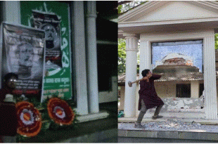 সাতক্ষীরা সংবাদদাতাঃ সাতক্ষীরার কলারোয়া উপজেলা পরিষদ চত্বরে বঙ্গবন্ধু শেখ মুজিবুর রহমানের প্রতিকৃতিতে পুষ্পমাল্য অর্পণ করা হয়। শুক্রবার (১৫ আগস্ট) রাত আনুমানিক সাড়ে ১২টার দিকে এ ঘটনা ঘটে। এতে ক্ষুব্ধ হয়ে ছাত্র—জনতা প্রতিকৃতিটি ভেঙে দিয়েছে। স্থানীয় সূত্রে জানা গেছে, পুষ্পমাল্যটি উপজেলা আওয়ামী লীগের ব্যানারে অর্পণ করা হয়। তবে দুপুরের দিকে বিক্ষুব্ধ …