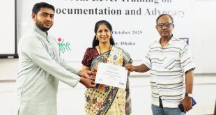 সাতক্ষীরা প্রতিনিধি: আন্তর্জাতিক মানবাধিকার ফেডারেশন (FIDH)-এর সদস্য বাংলাদেশের মানবাধিকার সংস্থা (অধিকারের) উদ্যোগে ১৯ অক্টোবর (রবিবার) ঢাকায় ৩ দিনব্যাপী মানবাধিকার বিষয়ক প্রশিক্ষণ কর্মশালা শেষে সাংবাদিক মুজাহিদুল ইসলামকে মানবাধিকারের সনদ প্রদান করা হয়। এ সময় সনদ প্রদান করেন (অধিকার) মানবাধিকার সংস্থার পরিচালক তাসকিন ফাহমিনা, পরিচালক এ এস এম নাসির উদ্দিন এলান। আরো …