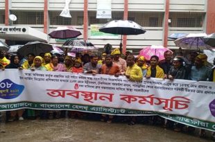 সাতক্ষীরায় বৈরী আবহাওয়ার মধ্যেও ৬ দফা দাবিতে অবস্থান কর্মসূচি পালন করেছে স্বাস্থ্য সহকারীরা। মঙ্গলবার (৮ জুলাই) সকাল ৯টা থেকে বেলা ১১টা পর্যন্ত সাতক্ষীরা সিভিল সার্জনের কার্যালয়ের সামনে বাংলাদেশ হেলথ্ অ্যাসিস্ট্যান্ট অ্যাসোসিয়েশন সাতক্ষীরা জেলা শাখার আহবানে এই অবস্থান কর্মসূচি পালিত হয়। সাতক্ষীরা জেলা হেলথ অ্যাসিস্ট্যান্ট অ্যাসোসিয়েশনের সভাপতি মোঃ আলী হোসেনের সভাপতিত্বে …