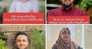 আলহামদুলিল্লাহ!! বিস্তারিত জাহাঙ্গীরনগর বিশ্ববিদ্যালয় কেন্দ্রীয় ছাত্র সংসদ (জাকসু) এর ফল প্রকাশ: ১/ভিপি- আব্দুর রশিদ জিতু (স্বতন্ত্র শিক্ষার্থী প্যানেল) ২/জিএস- মো: মাজহারুল ইসলাম (শিবির প্যানেল) ৩/এজিএস (পুরুষ)- ফেরদৌস আল হাসান (শিবির প্যানেল) ৪/এজিএস (নারী)- আয়েশা সিদ্দীকা মেঘলা (শিবির প্যানেল) ৫/শিক্ষা ও গবেষণা সম্পাদক- আবু ওবায়দা ওসামা (শিবির প্যানেল) ৬/পরিবেশ ও প্রকৃতি …