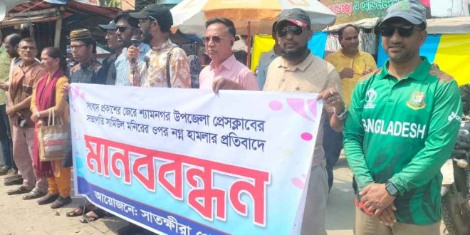সাতক্ষীরা সংবাদদাতাঃ সংবাদ প্রকাশের জেরে সাতক্ষীরার শ্যামনগর প্রেসক্লাবের সভাপতি সামিউল মনিরের ওপর নগ্ন হামলার প্রতিবাদ এবং হামলাকারীদের গ্রেফতাদের দাবিতে সাতক্ষীরায় মানববন্ধন অনুষ্ঠিত হয়েছে। মঙ্গলবার (৩ মার্চ) ১১টায় শহরের নিউ মার্কেট মোড়ে এই মানববন্ধনের আয়োজন করা হয়। এদিকে সাংবাদিকের ওপর হামলার জেরে শ্যামনগর উপজেলা যুবদলের সদস্যসচিব আনোয়ারুল ইসলাম আঙুর, যুগ্ম আহ্বায়ক …